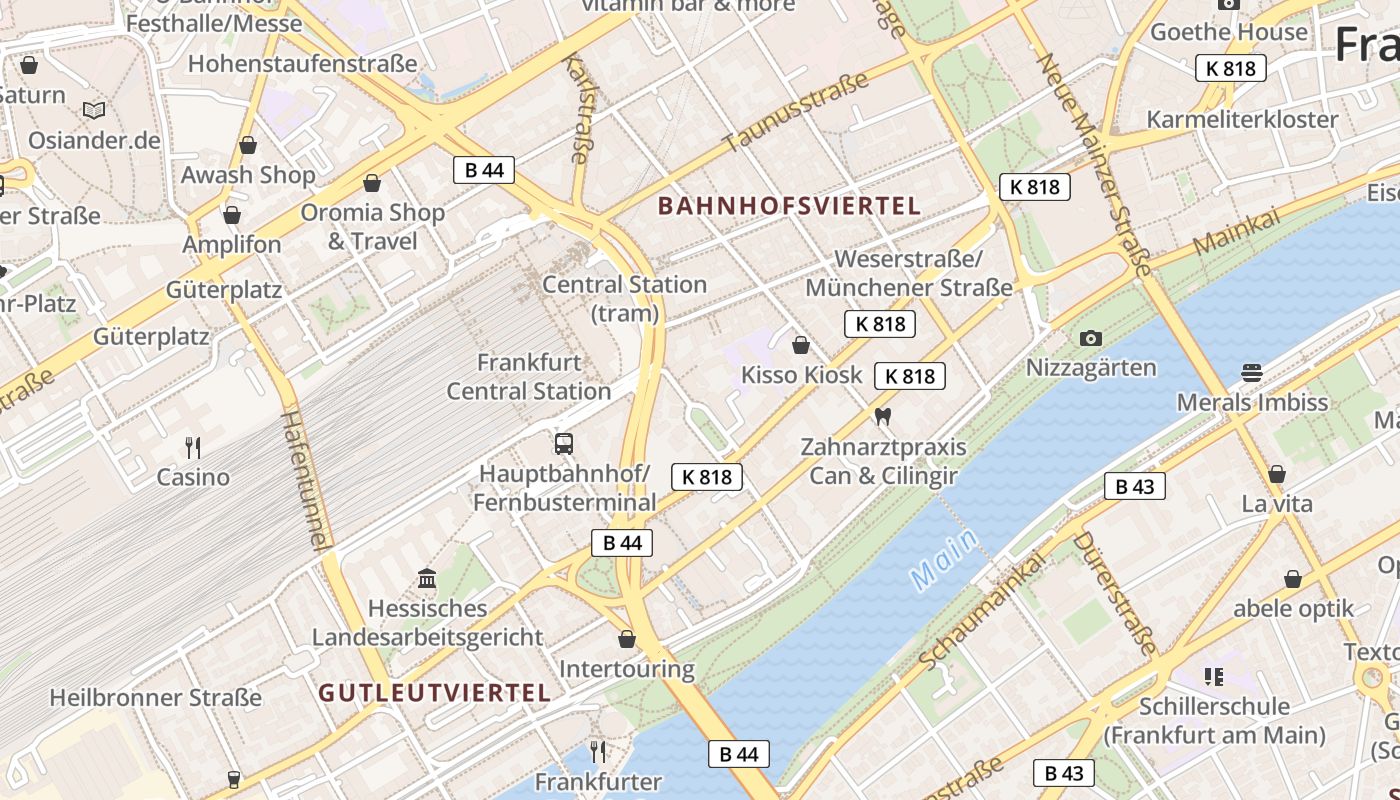 Schauspiel und Neue Oper ist in 9 Fußminuten Entfernung. Die Einkaufsstraße Zeil in ca. 2 km Entfernung vom Le Meridien Frankfurt Frankfurt am Main ist eine der nahegelegenen Attraktionen. Das Hotel liegt gleich neben der Katharinenkirche, während die Bushaltestelle Fernbusbahnhof Frankfurt am Main innerhalb von nur 10 Gehminuten zu erreichen ist. Diese Unterkunft befindet sich in Frankfurt am Main 550 Meter vom Bahnhof Haupt Frankfurt entfernt.
